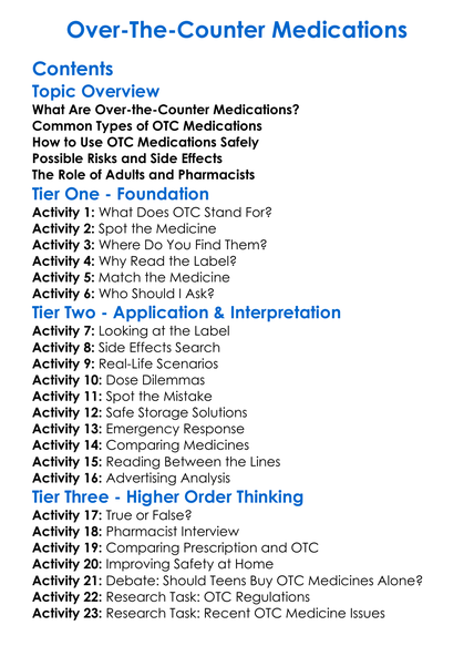 Over-The-Counter Medications Worksheet Activity Booklet