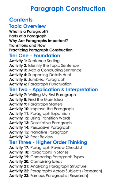 Paragraph Construction Worksheet Activity Booklet