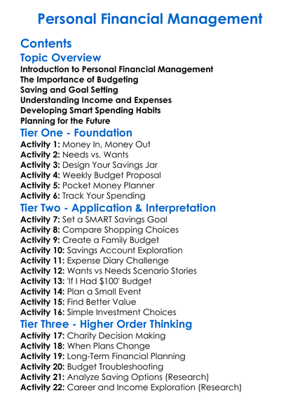 Personal Financial Management Worksheet Activity Booklet