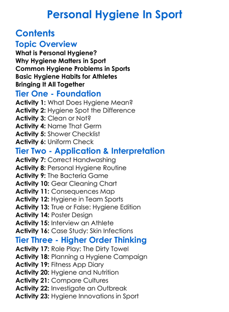 Personal Hygiene In Sport Worksheet Activity Booklet