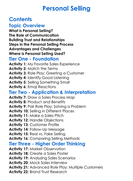 Personal Selling Worksheet Activity Booklet