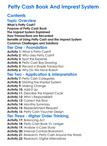 Petty Cash Book And Imprest System Worksheet Activity Booklet