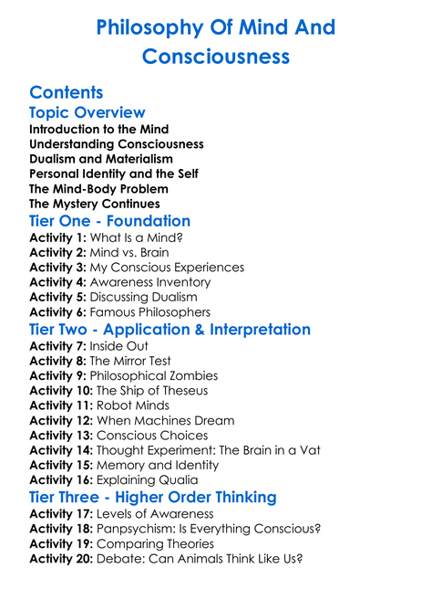 Philosophy Of Mind And Consciousness Worksheet Activity Booklet
