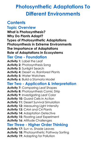Photosynthetic Adaptations To Different Environments Worksheet Activity Booklet
