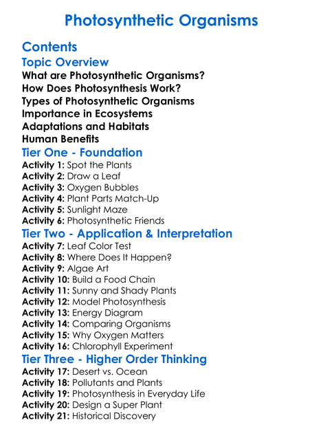 Photosynthetic Organisms Worksheet Activity Booklet