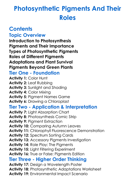 Photosynthetic Pigments And Their Roles Worksheet Activity Booklet