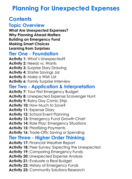 Planning For Unexpected Expenses Worksheet Activity Booklet