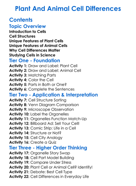 Plant And Animal Cell Differences Worksheet Activity Booklet