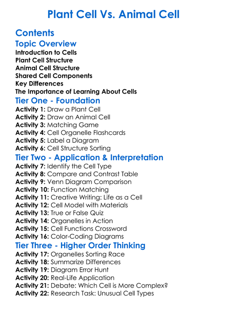 Plant Cell Vs Animal Cell Worksheet Activity Booklet