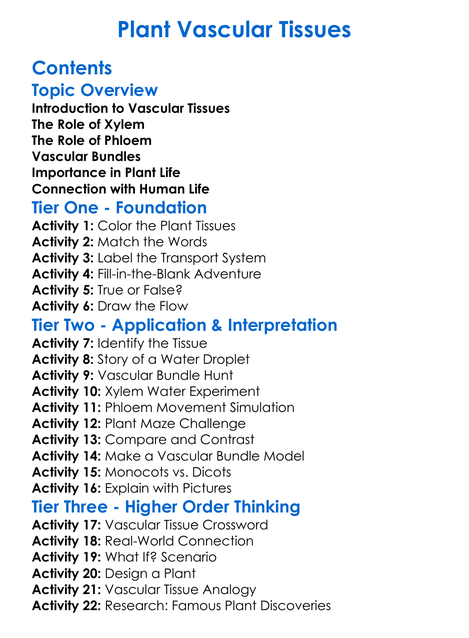 Plant Vascular Tissues Worksheet Activity Booklet