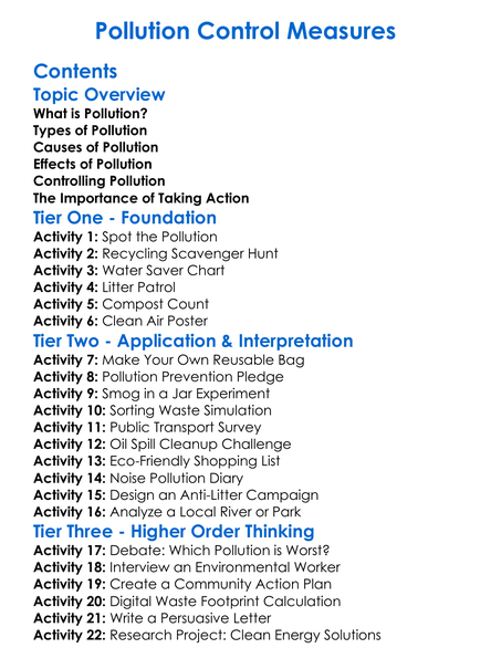 Pollution Control Measures Worksheet Activity Booklet