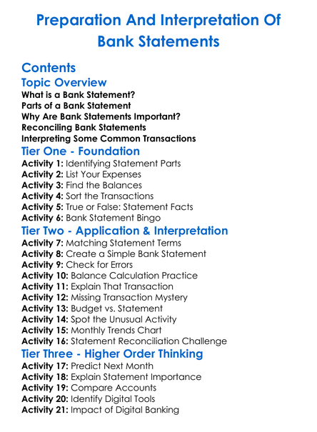Preparation And Interpretation Of Bank Statements Worksheet Activity Booklet