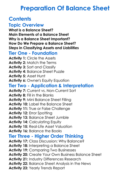Preparation Of Balance Sheet Worksheet Activity Booklet