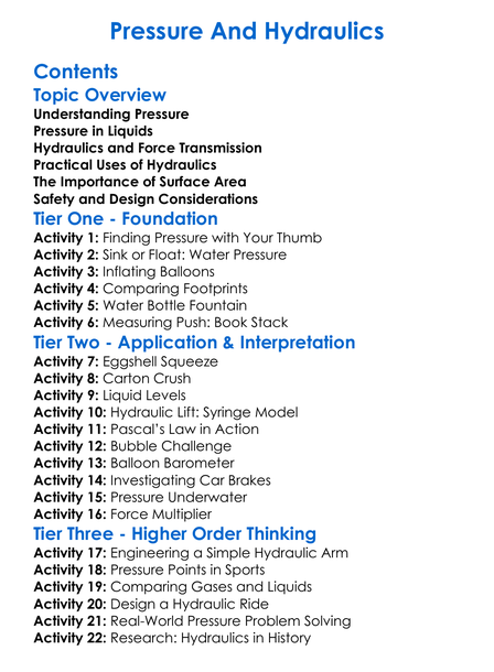 Pressure And Hydraulics Worksheet Activity Booklet