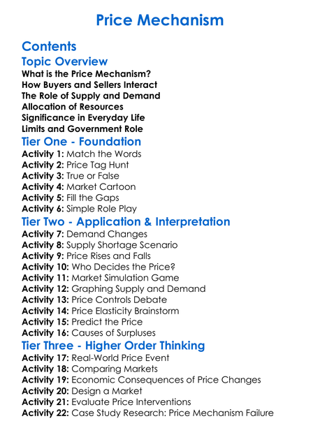 Price Mechanism Worksheet Activity Booklet