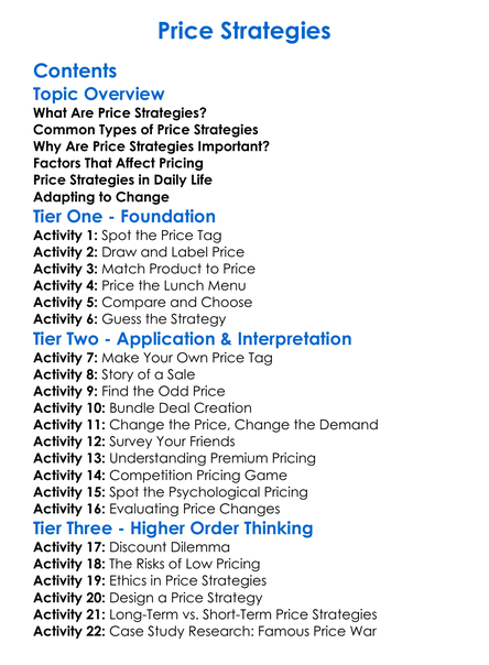 Price Strategies Worksheet Activity Booklet