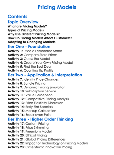 Pricing Models Worksheet Activity Booklet