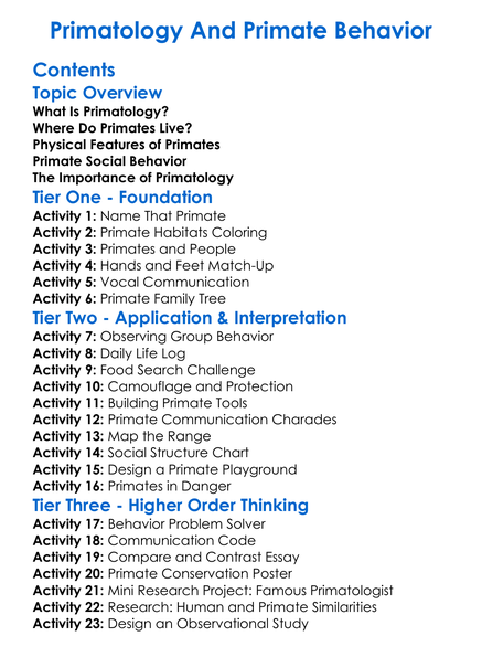Primatology And Primate Behavior Worksheet Activity Booklet