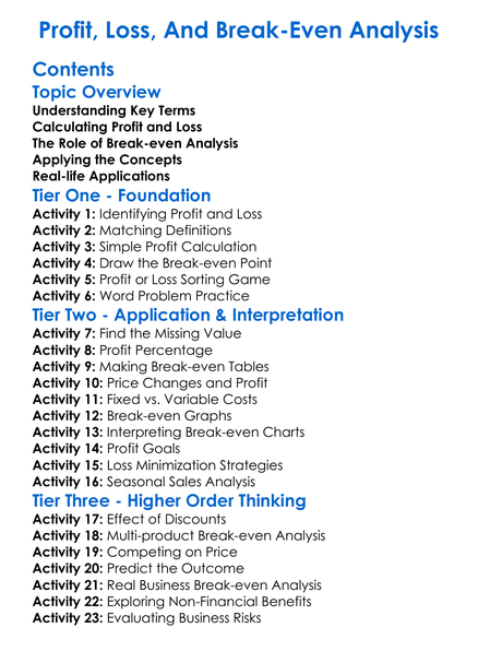 Profit Loss And Break-Even Analysis Worksheet Activity Booklet