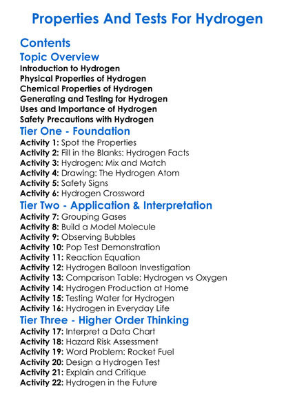 Properties And Tests For Hydrogen Worksheet Activity Booklet