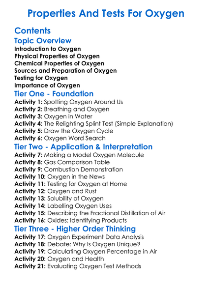 Properties And Tests For Oxygen Worksheet Activity Booklet