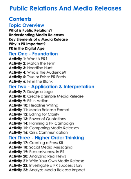 Public Relations And Media Releases Worksheet Activity Booklet