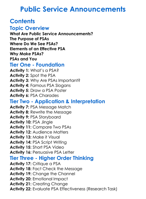 Public Service Announcements Worksheet Activity Booklet