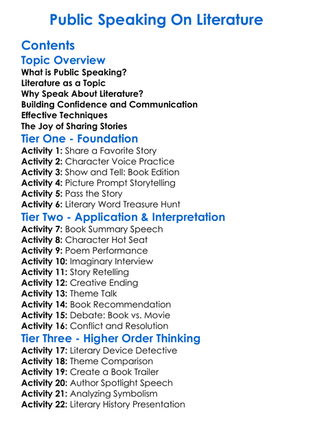 Public Speaking On Literature Worksheet Activity Booklet