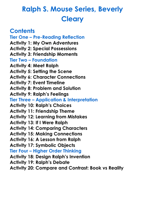 Ralph S Mouse Series Beverly Cleary Worksheet Activity Booklet