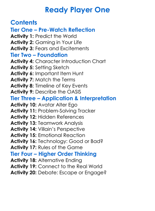 Ready Player One Worksheet Activity Booklet
