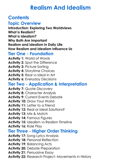 Realism And Idealism Worksheet Activity Booklet