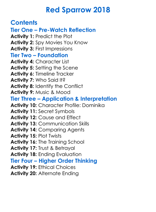 Red Sparrow 2018 Worksheet Activity Booklet