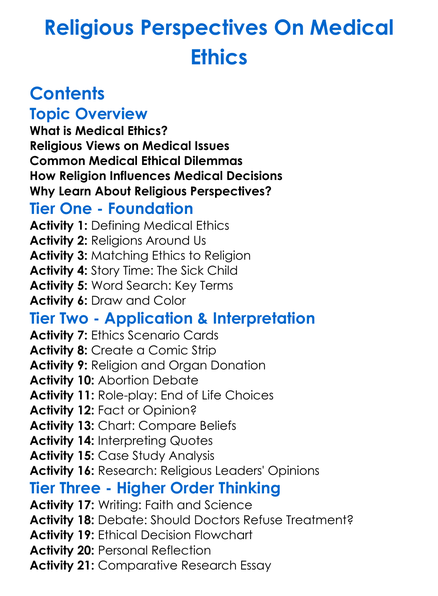 Religious Perspectives On Medical Ethics Worksheet Activity Booklet