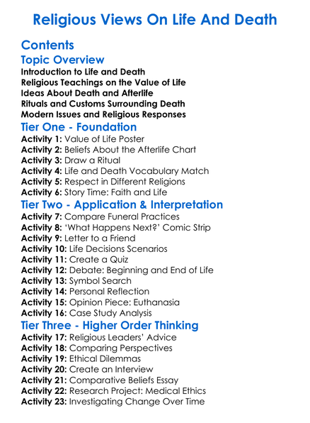 Religious Views On Life And Death Worksheet Activity Booklet