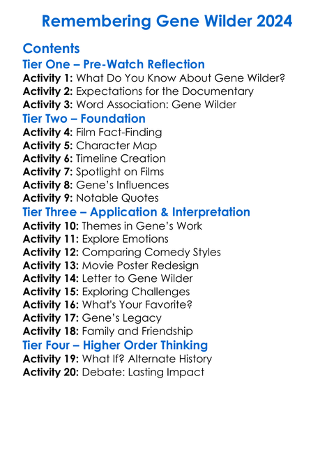 Remembering Gene Wilder 2024 Worksheet Activity Booklet