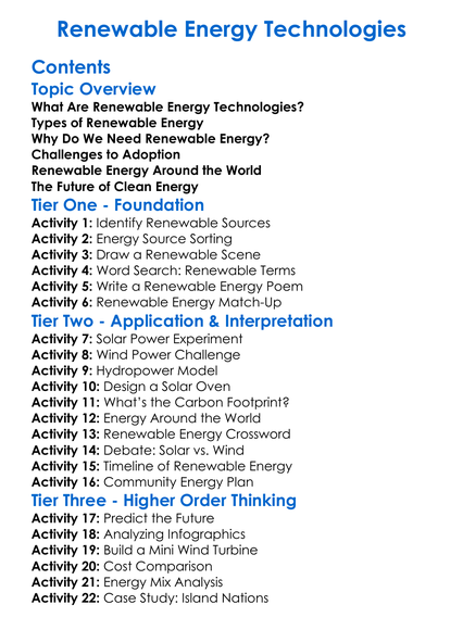 Renewable Energy Technologies Worksheet Activity Booklet