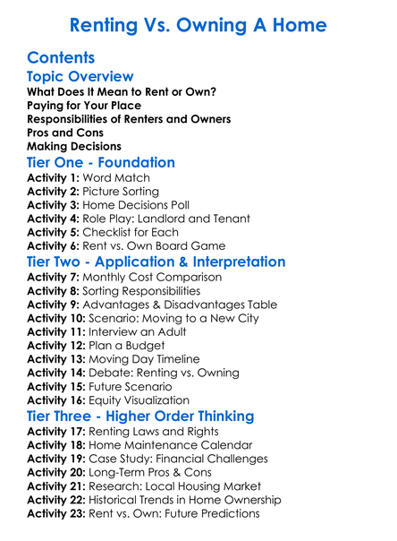 Renting Vs Owning A Home Worksheet Activity Booklet