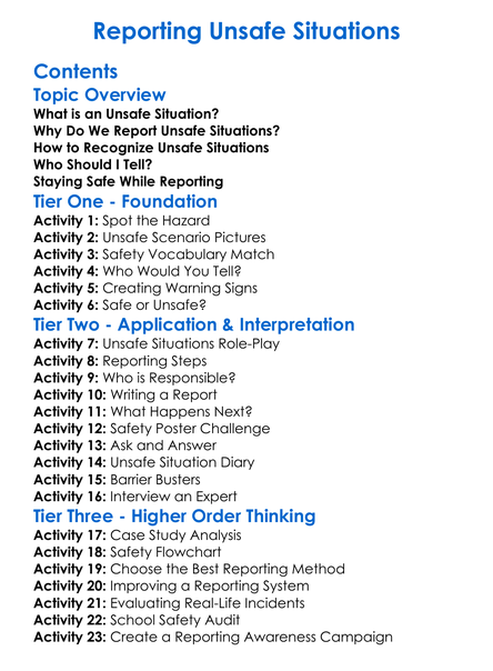 Reporting Unsafe Situations Worksheet Activity Booklet