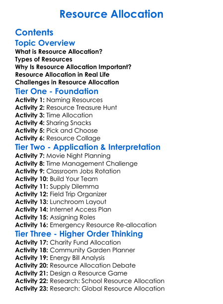 Resource Allocation Worksheet Activity Booklet