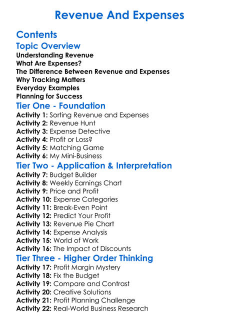 Revenue And Expenses Worksheet Activity Booklet