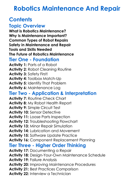Robotics Maintenance And Repair Worksheet Activity Booklet