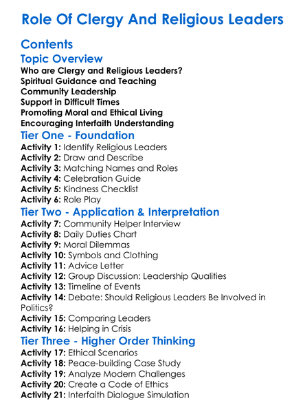 Role Of Clergy And Religious Leaders Worksheet Activity Booklet