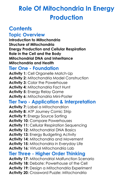 Role Of Mitochondria In Energy Production Worksheet Activity Booklet