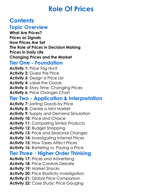 Role Of Prices Worksheet Activity Booklet