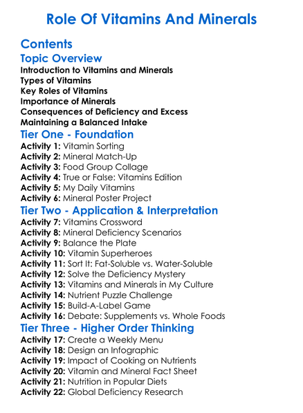 Role Of Vitamins And Minerals Worksheet Activity Booklet