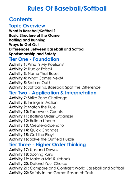 Rules Of Baseballsoftball Worksheet Activity Booklet