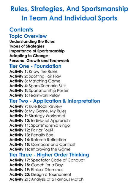 Rules Strategies And Sportsmanship In Team And Individual Sports Worksheet Activity Booklet