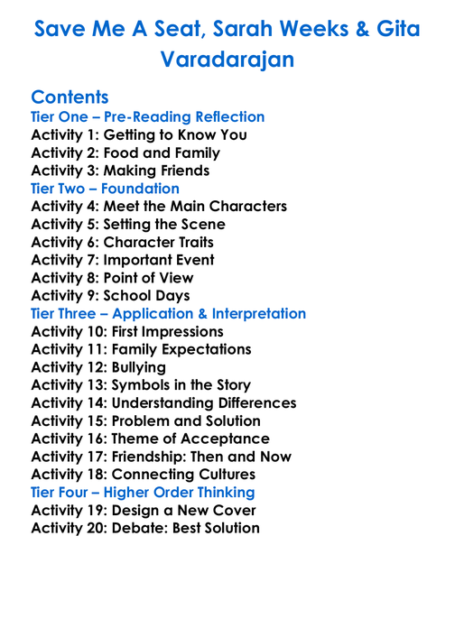 Save Me A Seat Sarah Weeks Gita Varadarajan Worksheet Activity Booklet