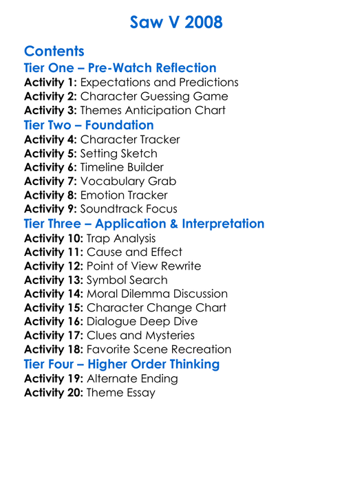 Saw V 2008 Worksheet Activity Booklet