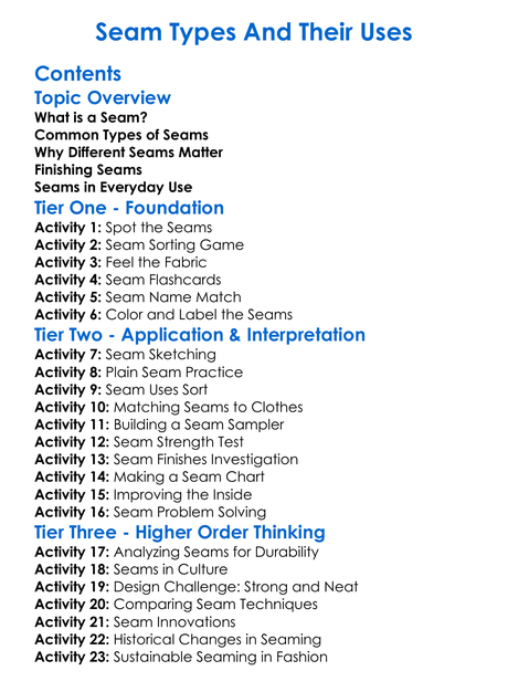 Seam Types And Their Uses Worksheet Activity Booklet
